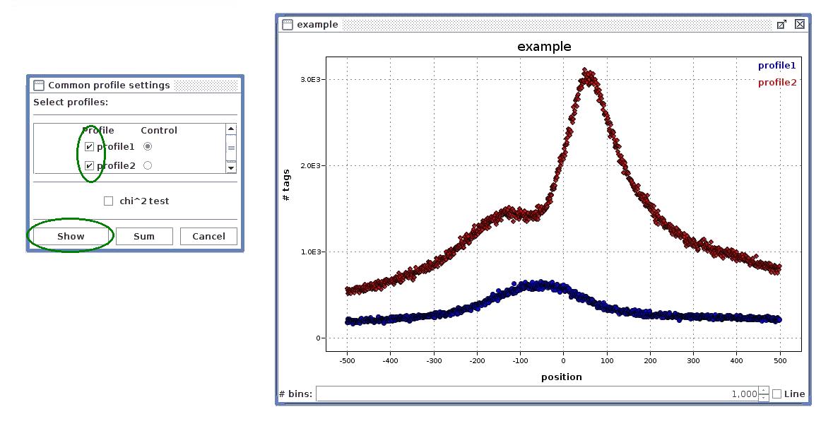 - Common loci profile - the chosen profiles are plotted on single plot. If chi^2 test option is checked, the selected profile is treated as control sample and Chi^2 tests are computed to obtain profiles similarity measure. The Sum option plots the sum of selected profiles.