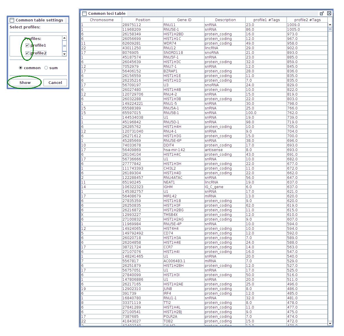 - Common loci table - results are shown in one table, placing the same genes from different profiles in single row. The sum variant shows all genes from selected profiles filling missing values with zeros. The common variant shows only genes that appear in all profiles.