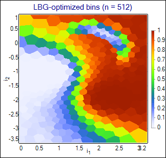 This simple 2-dimmensional example illustrates characteristical features of various algorithms. Parameters of each algorithm have been tuned to obtain highest purity-efficiency curves. Although the curves are quite similar for all algorithms, the differences are visible on the classificators output plotted as a function of input vectors. Following images show the output function for the kNN algorithm with the number of the neighbours set to 32, LBGBins algorithm with 512 sectors, and PDE algorithm with the width = 0.06. For comparison, neural network was trained on the same training set and its output is also shown. Weights of this network are attached to the zip file (network_weights.NetAscii).